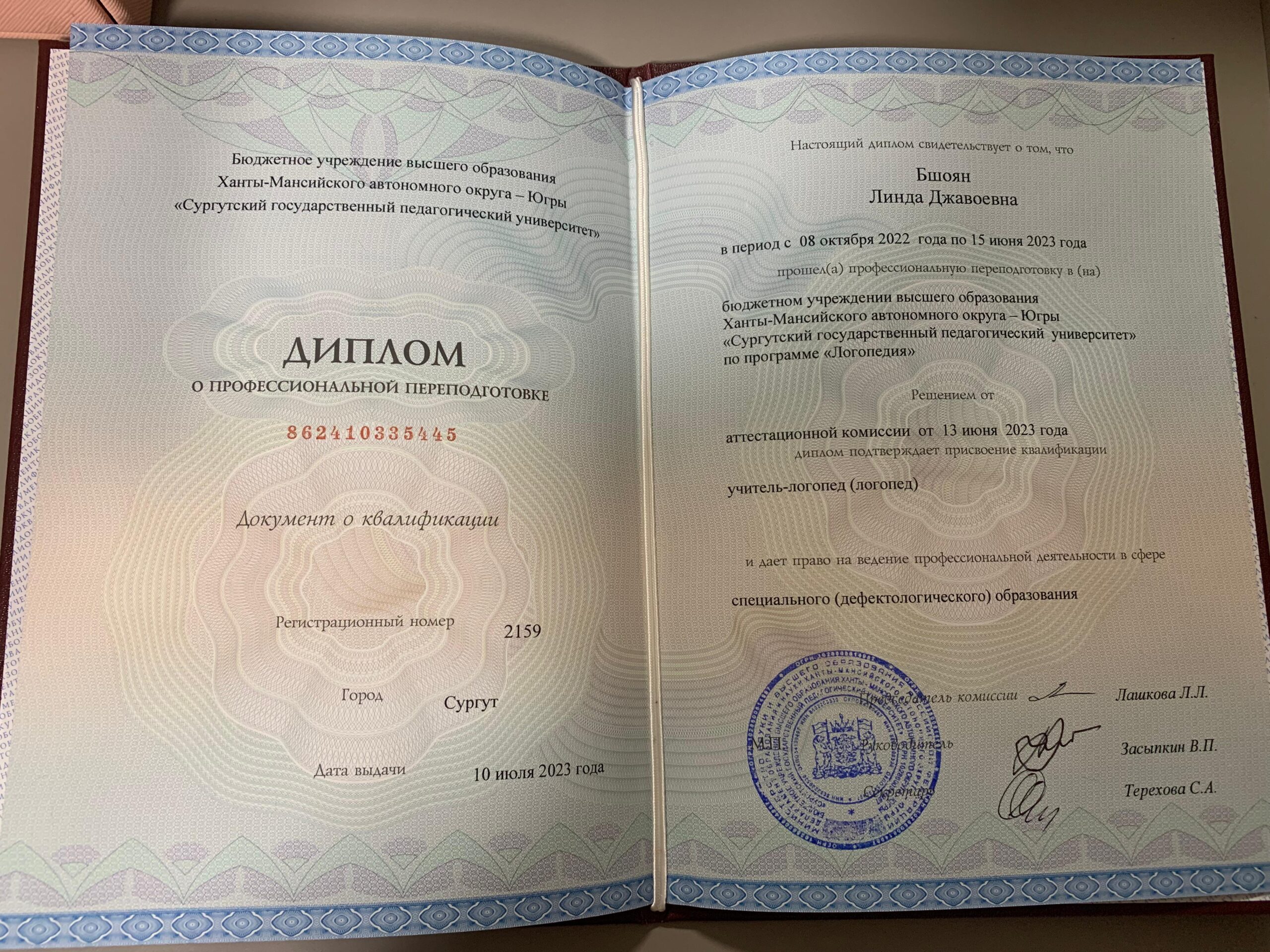 2023г — Диплом «Логопед», Сургутский государственный педагогический университет