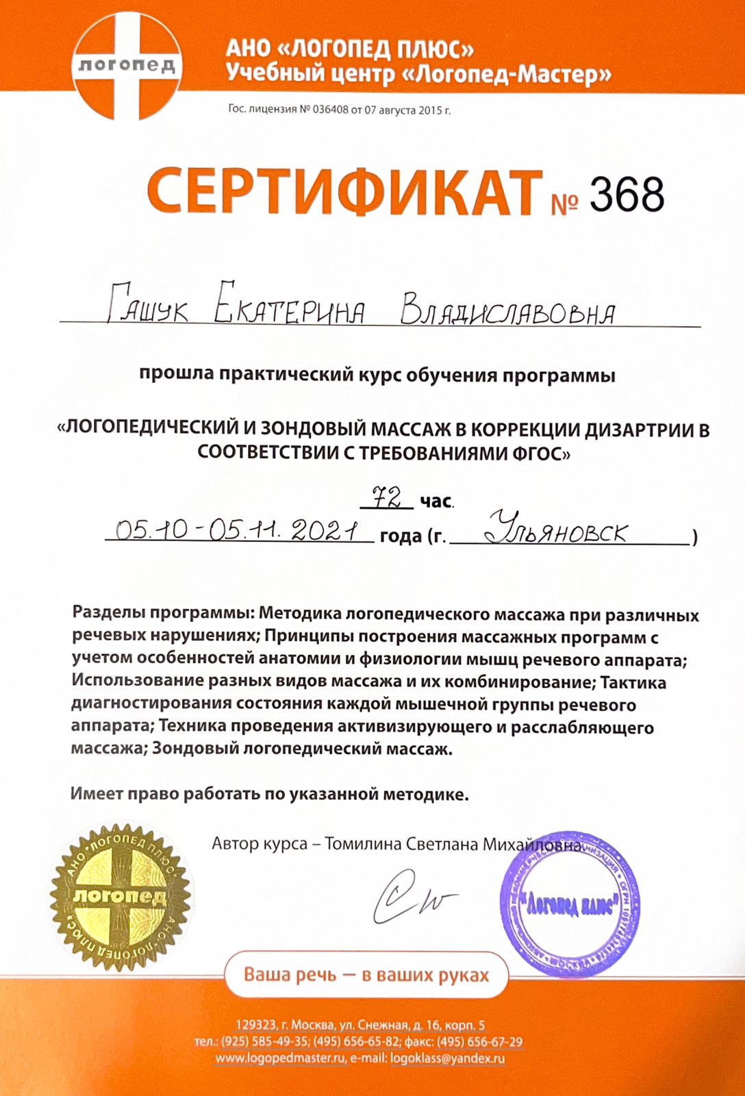 2021г — Практический курс «Логопедический и зондовый массаж в коррекции дизартрии в соответствии с требованиями ФГОС», УЦ «Логопед-Мастер», Томилина С.М.