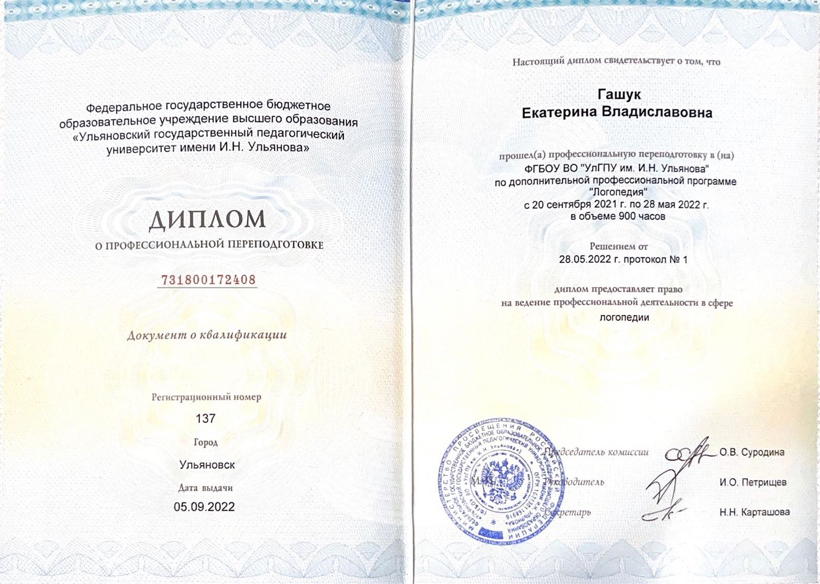 2022г — Диплом «Логопед», ФГБОУ ВО «УлГПУ им. И.Н. Ульянова»