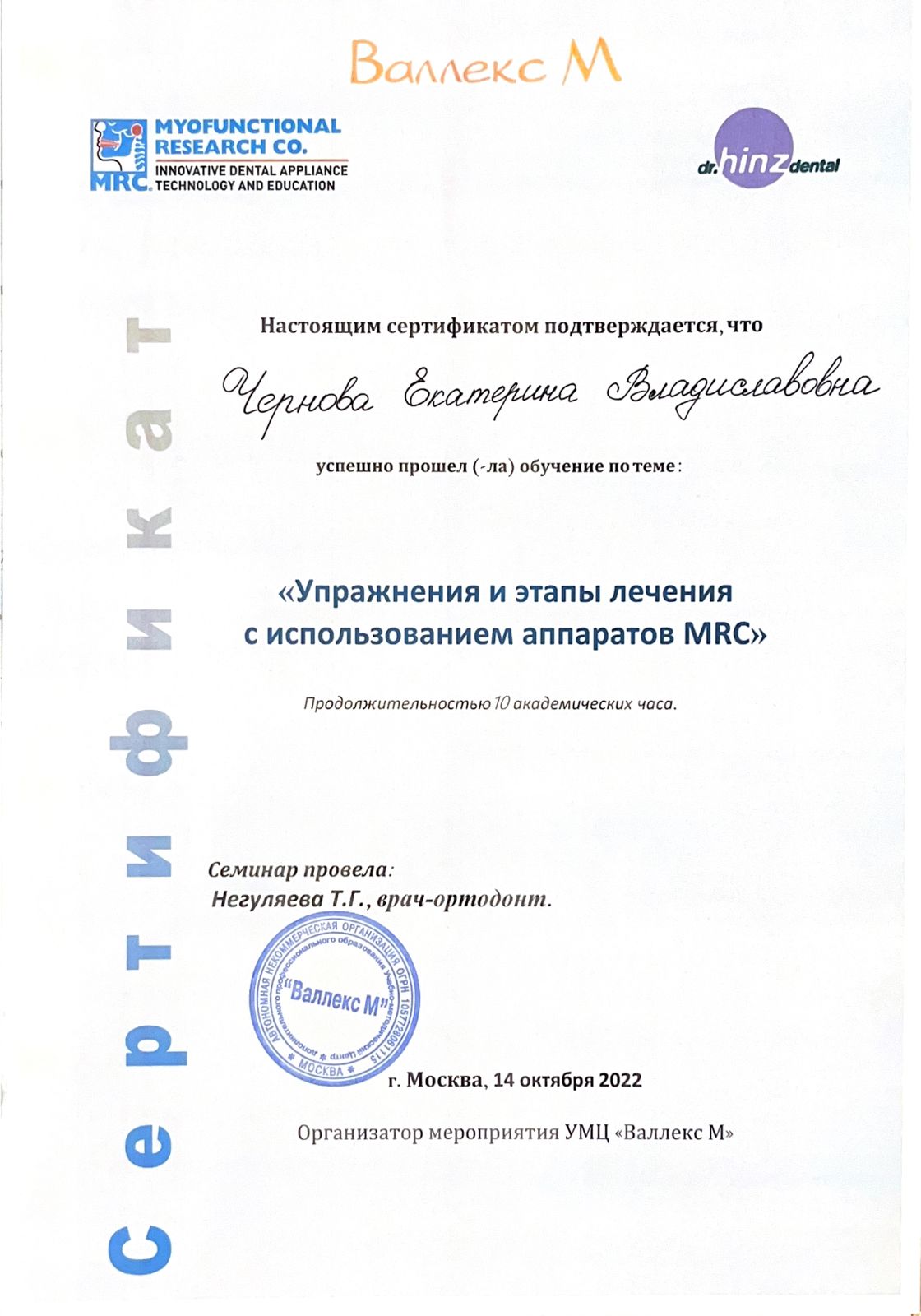2022г — Курс «Упражнения и этапы лечения с использованием аппаратов MRC», УМЦ «Валекс М»