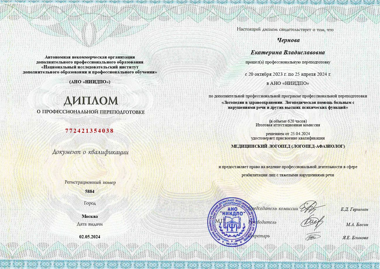 2024г — Диплом «Медицинский логопед (логопед-афазиолог)», АНО НИИДПО