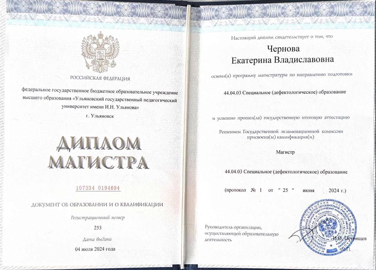 2024г — Диплом «Специальное (дефектологическое) образование» (Магистр), ФГБОУ ВО «УлГПУ им. И.Н. Ульянова»