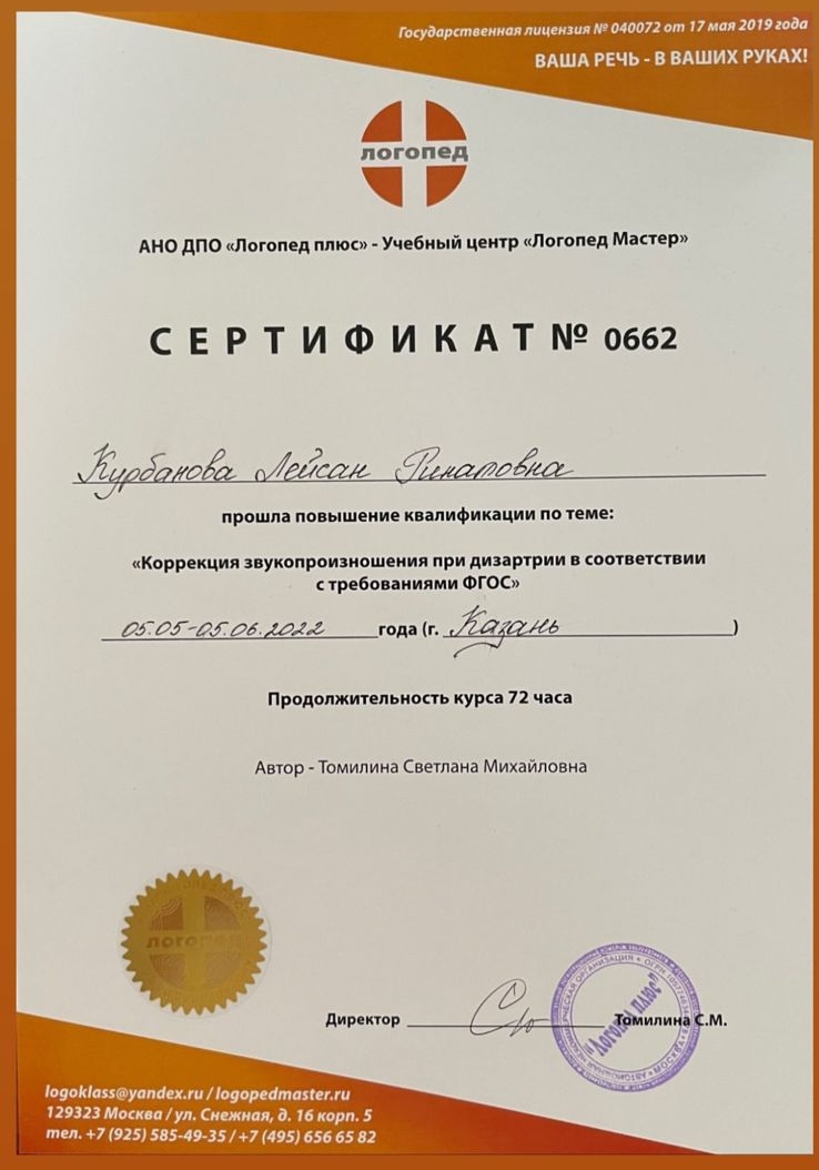 2022г – Повышение квалификации “Коррекционное звукопроизношение при дизартрии в соответствии с требованиями ФГОС”, Логопед Мастер, Томилина С.М.