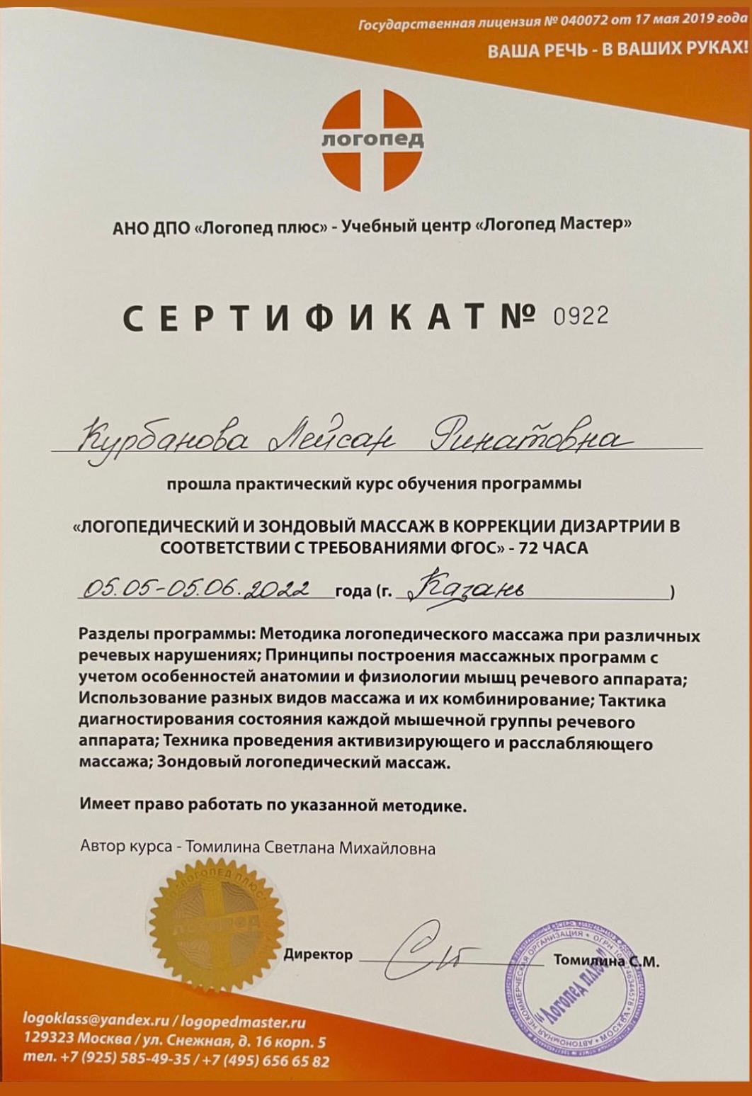 2022г – Практический курс “Логопедический и фондовый массаж в коррекции дизартрии в соответствии с требованиями ФГОС”, Логопед Мастер, Томилина С.М.