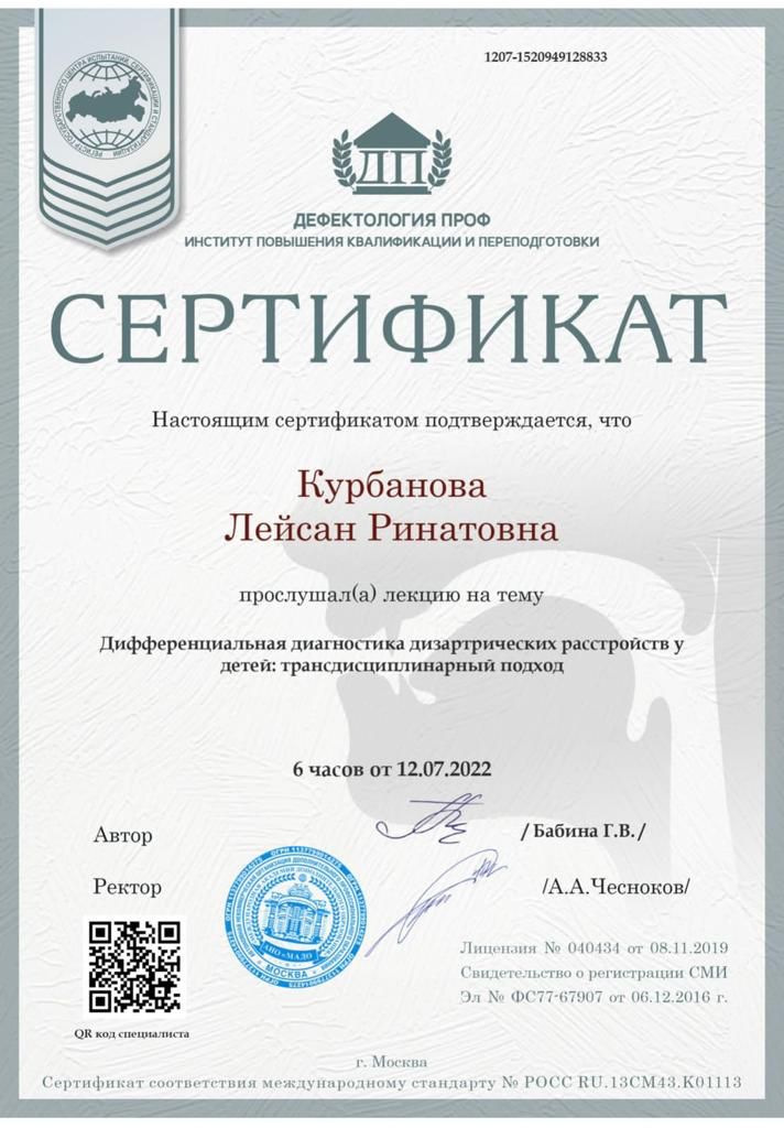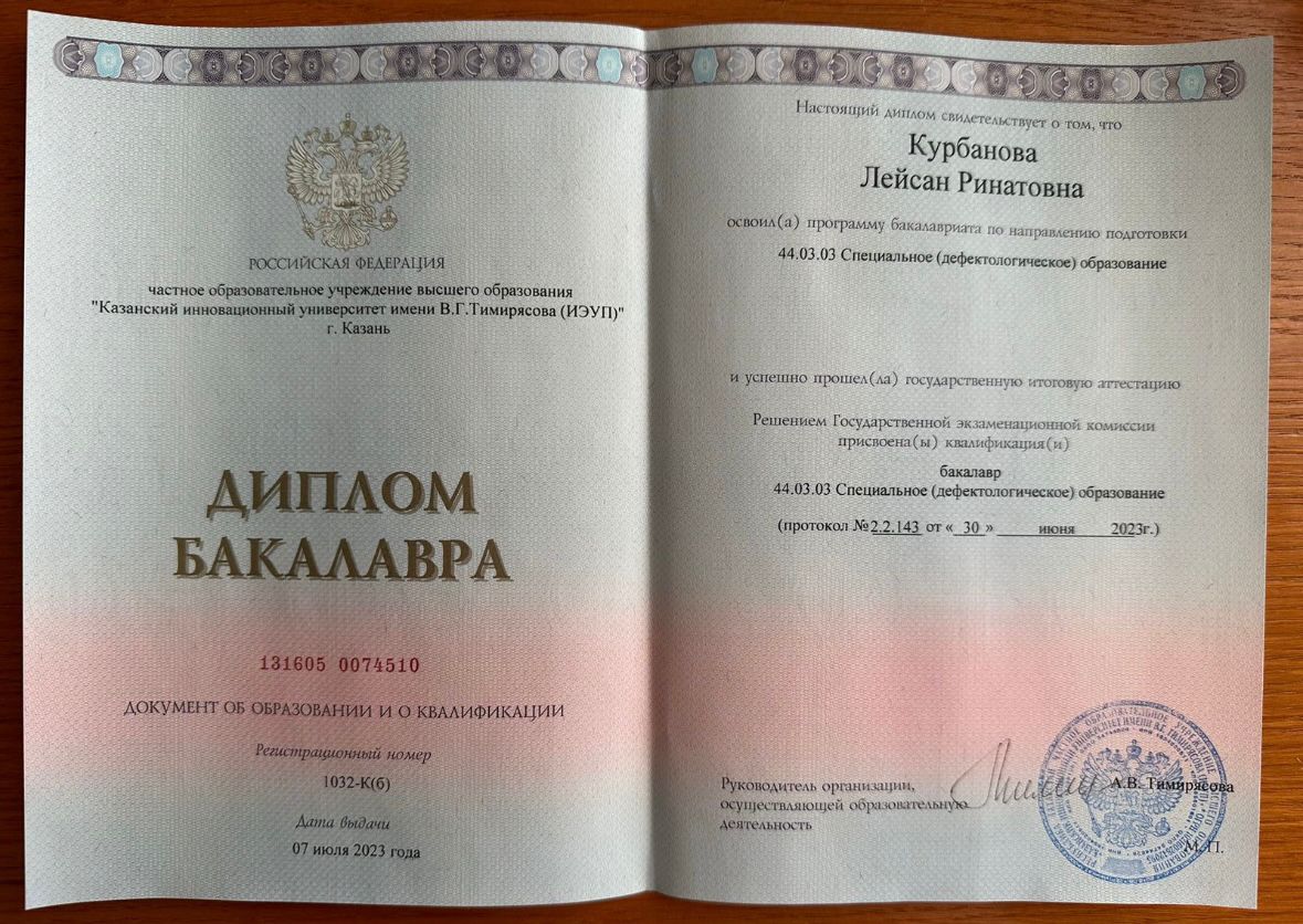 2023г – Диплом “Специальное (дефектологическое) образование”, Казанский Инновационный университет имени В.Г. Тимирязева (ИЭУП)