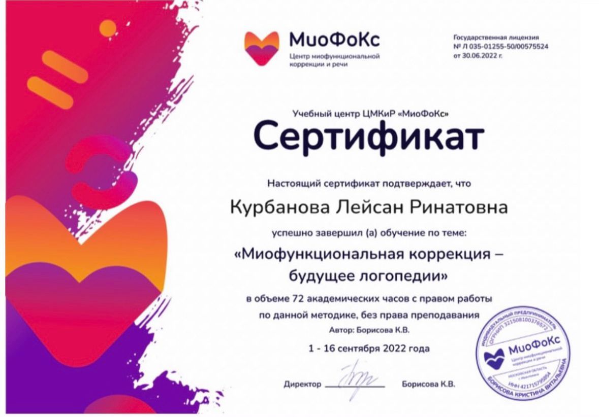 2022г – Курс “Миофункциональная коррекция — будущее логопедии”, МиоФоКс, Борисова К.В.