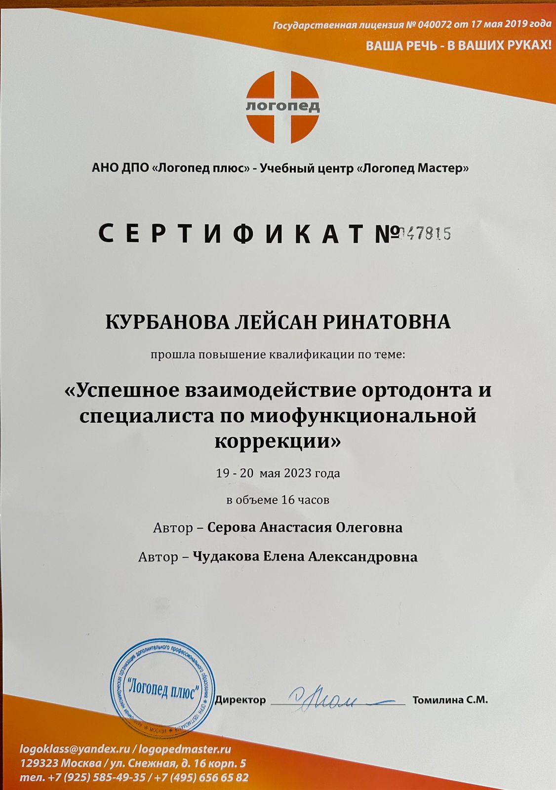 2022г – Повышение квалификации “Успешное взаимодействие ортодонт и специалиста по миофункциональной коррекции”, Логопед Мастер, Серова А.О, Чудакова Е.А.