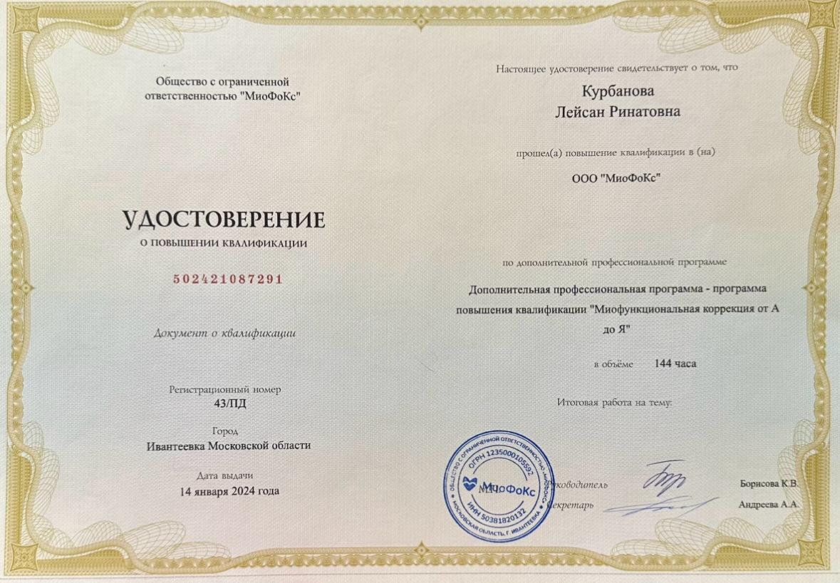 2024г – Повышение квалификации “Миофунциональная коррекция от А до Я”, МиоФоКс, Борисова К.В.