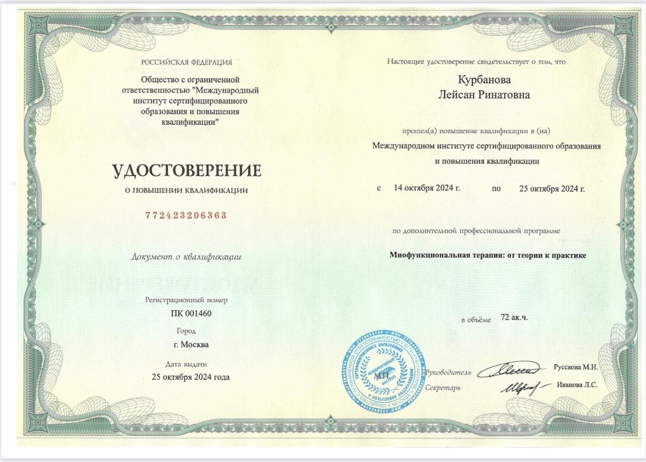 2024г – Курс “Миофункциональная терапия: от теории к практике”, Международный институт сертифицированного образования и повышения квалификации