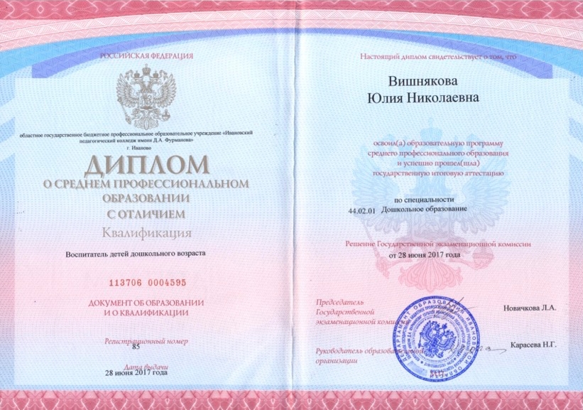 2017г — Диплом «Воспитатель детей дошкольного возраста», Ивановской педагогический колледж имени Д.А. Фурманова