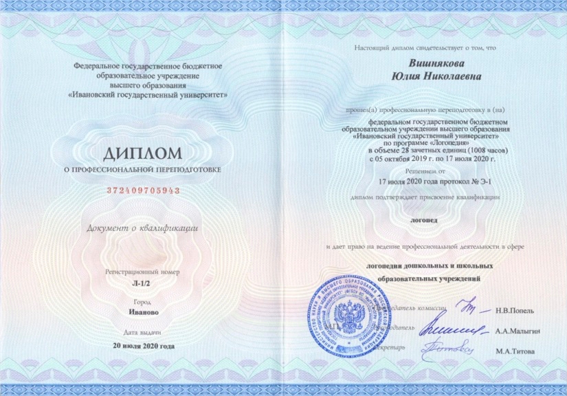 2020г — Диплом «Логопед», Ивановский государственный университет