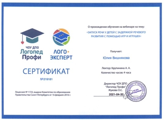 2021г — Вебинар «Запуск речи у детей с задержкой речевого развития с помощью игр и игрушек», Логопед Профи, Крупинина А.А.