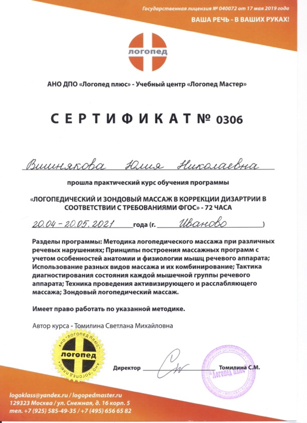 2021г — Курс «Логопедический и зондовый массаж в коррекции дизартрии в соответствии с требованиями ФГОС», Логопед Мастер, Томилина С.М.