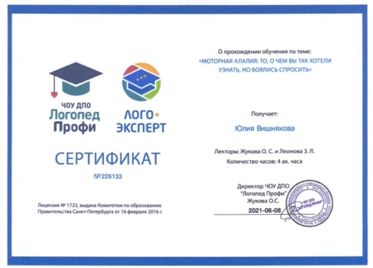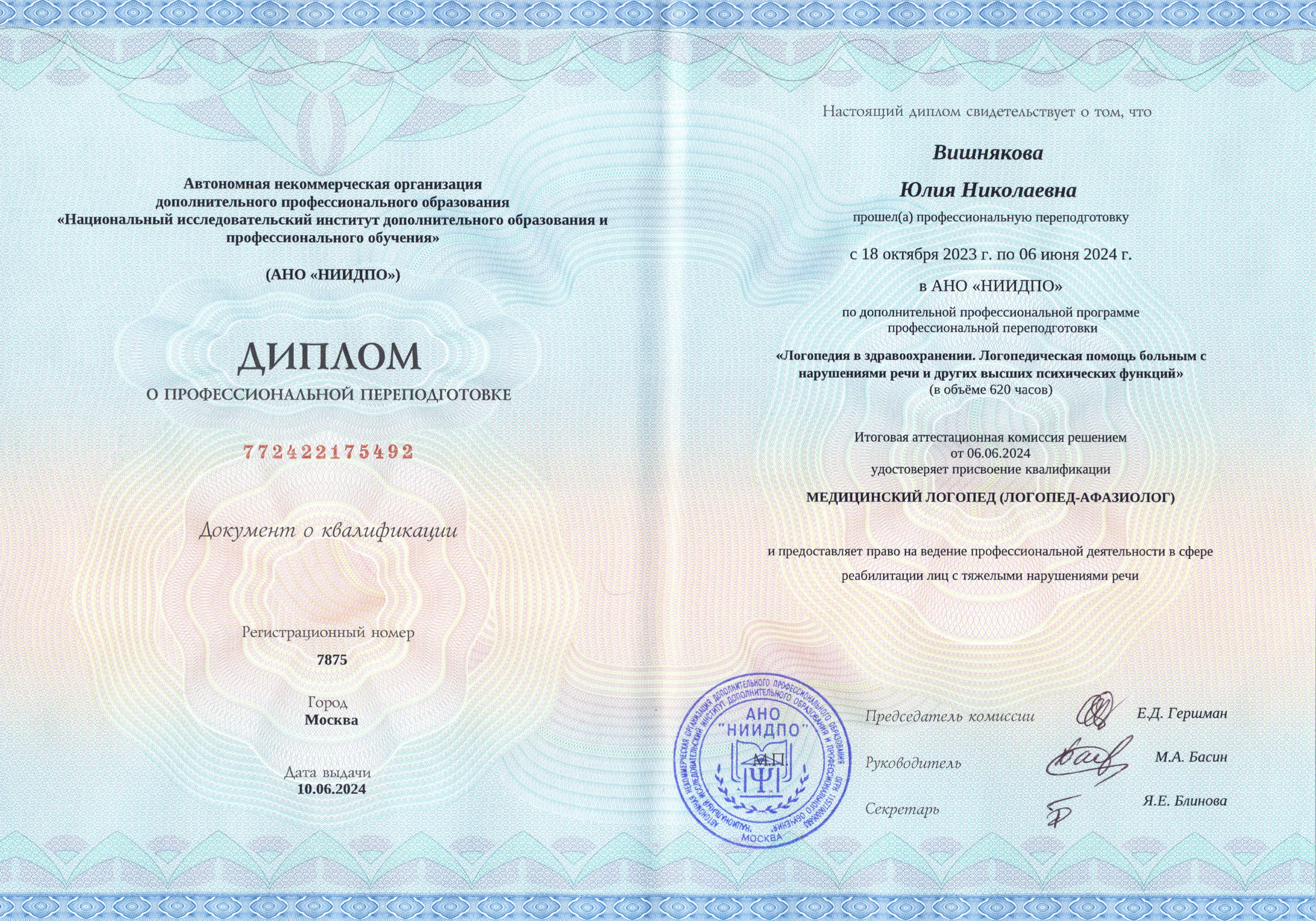 2024г – Диплом о профессиональной переподготовке “Медицинский логопед”, АНО “НИИДПО”