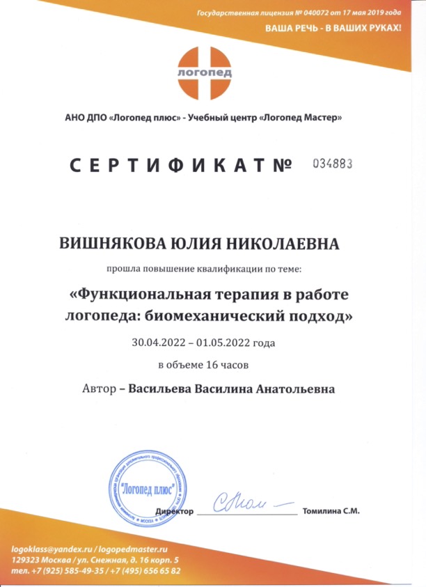 2022г — Повышение квалификации «Функциональная терапия в работе логопеда: биомеханический подход», Логопед Мастер, Васильева В.А.