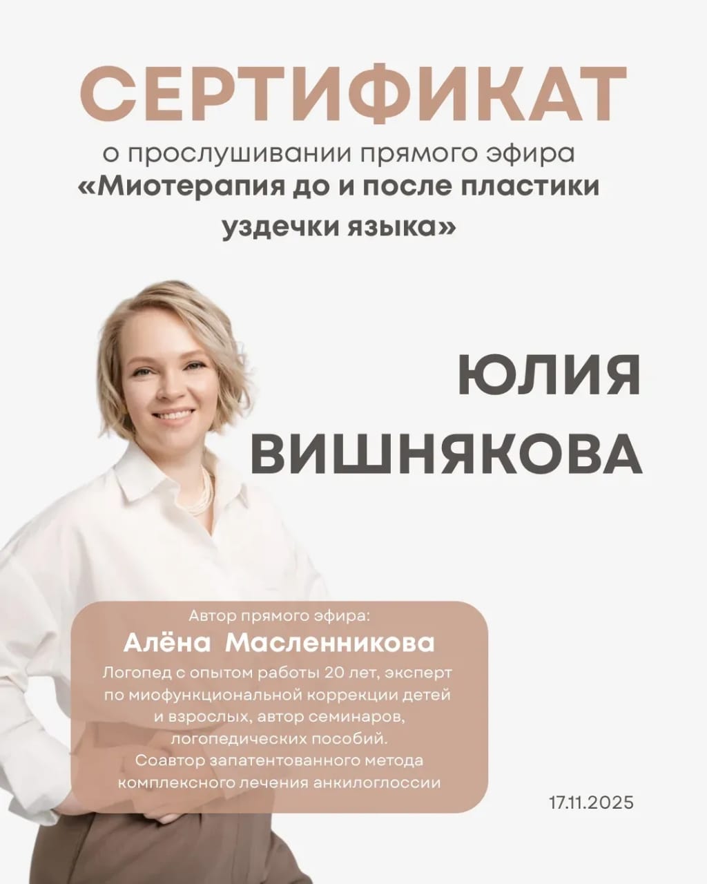 2025г – Вебинар “Миотерапия до и после пластики уздечки языка”, Масленникова А.